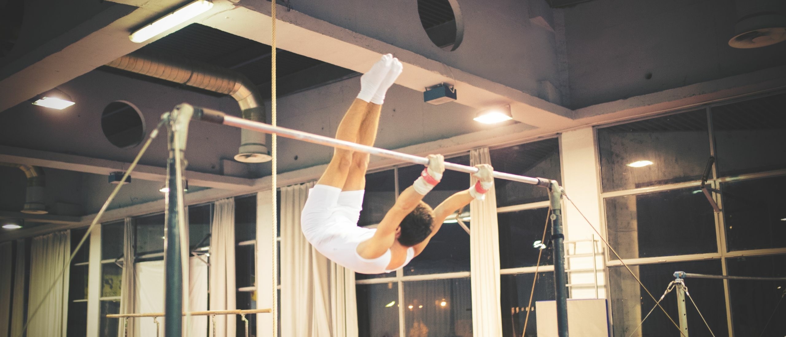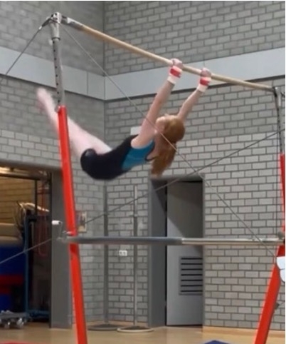 De turn(st)er zwaait door tot boven de ligger en vangt de beweging op in een gecontroleerde steunpositie.