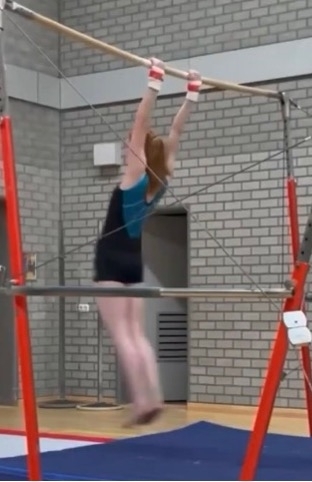 Een andere herkenbare fout is te weinig hoogte in de beweging. De turnster komt simpelweg niet boven de legger uit. Dit is meestal geen krachtprobleem, maar een gevolg van slechte timing in de zwaai of een onvoldoende actieve schop met de benen.